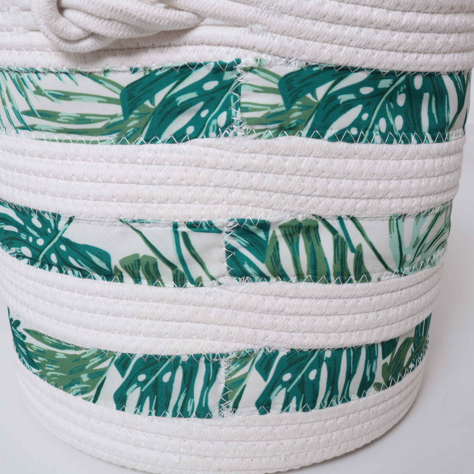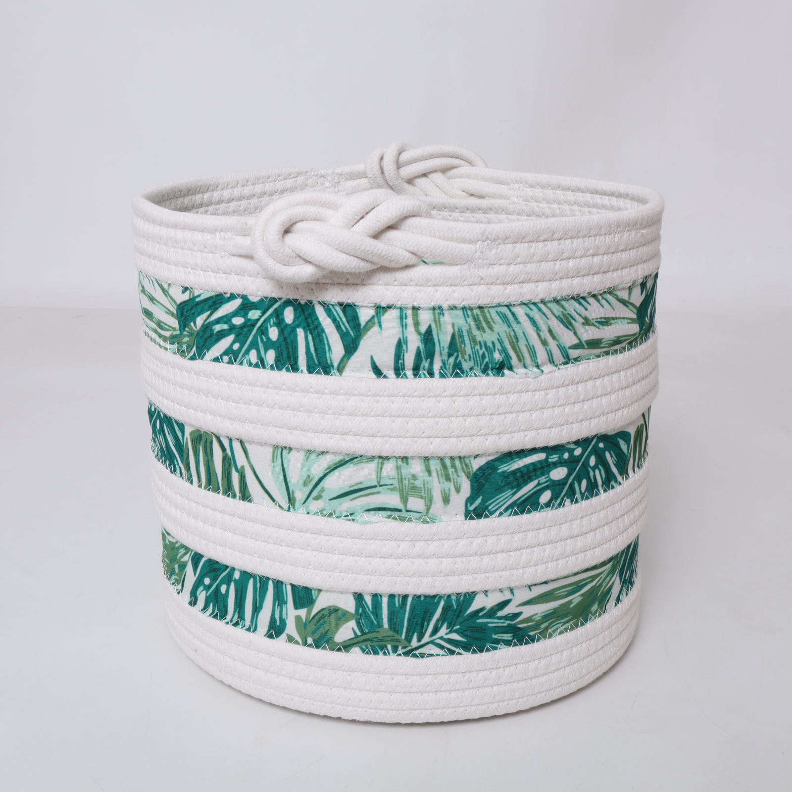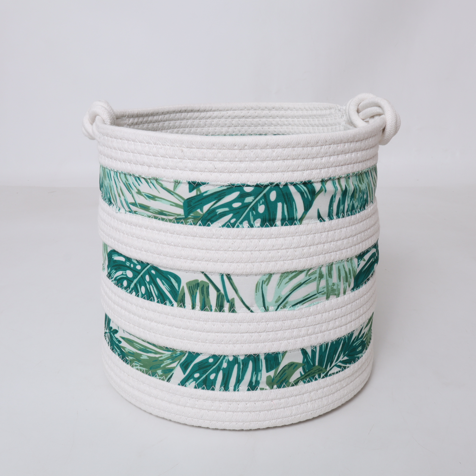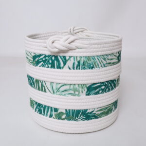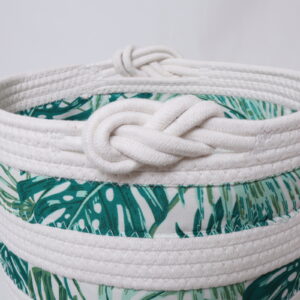 Bring a sense of natural beauty and harmony into your home with this timeless piece. Order the White Cotton Rope Basket with Green Leaves Printing Fabric today and redefine your organizational style.
